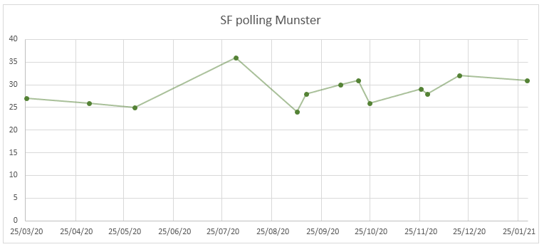 - This poll is in line with recent ones for FG, but they have consistently dropped from low 30s to high 20s nationally since November, though they continue to dominate Dublin.