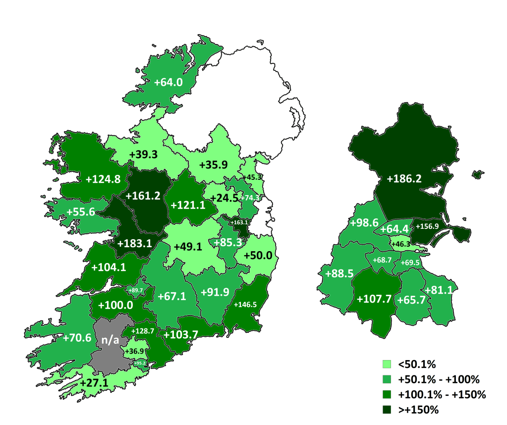 Below is a map of Sinn Fein’s vote change between the general election in 2016, which was itself their best election since 1923, and 2020. The numbers express the vote increase as a percentage of the 2016 figure (for example, the +100.0 in Limerick County indicates that SF doubled their FPV there from 2016 to 2020).