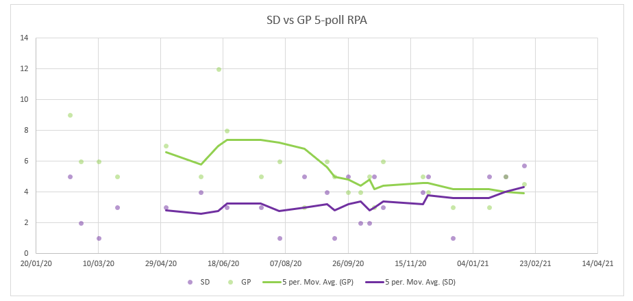 The group most obviously posed to benefit from the ebb of the Green Wave, despite the PBP’s recent pivot towards eco-socialism, are the Social Democrats. Below is a five-poll rolling average of the two parties’ support levels since GE 2020: