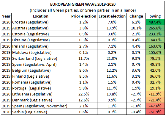 It’s worth noting that the impact of the Green Wave is, in general, as much a social phenomenon as an actual political one, and was far from the universal surge it was cast as. Below is a table showing the performance of Green (in the ideological sense) parties in legislative elections over the last two years, when the Green Wave was reaching its zenith.