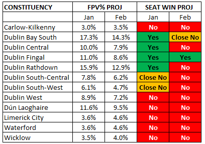 Seven constituencies have a projected change; six of them are in Dublin, mostly due to declining numbers in the capital for the Green Party and Fine Gael. The other constituency, is, bluntly, problematic for the modelling. The constituencies and changes are as follows: