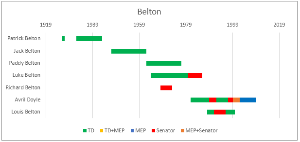 Patrick Belton might be a bit more widely known, either for his participation in the IRB and the Easter Rising, or his later pivot to out-and-out fascism (and unlike Charlie Flanagan’s dad, Belton’s pivot more or less killed his political career). But I certainly wasn’t aware that his descendants, including Avril Doyle, had been elected at national or European level for over 60 consecutive years. I think, regardless of all else, it’s pretty neat that they spent so long participating in the democracy that Belton spent the latter part of his life trying to destroy.