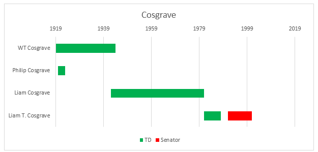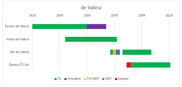 I was surprised in the process of researching this to discover that there hasn’t been – as far as I can tell anyway – a family that has held unbroken national or European office since the first Dáil. There are two who have come close, and neither of them should be a huge surprise: