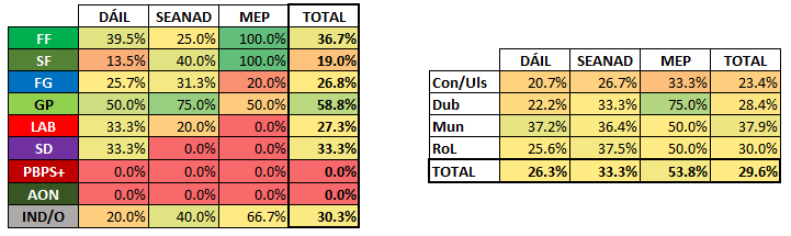 Note that this includes two recently resigned Senators – Michael D’Arcy (FG) & Elisha McCallion (SF) as their replacements have not been elected yet. There’s no database for this; it was put together from my own research, so there may be some I have missed.