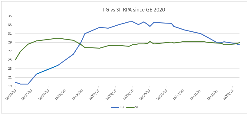 Regardless, Sinn Féin moved ahead of Fine Gael on the national RPA (which does factor in Ireland Thinks) for the first time in a long time – they are now at 29% to FG’s 28.5%. This gap has been slowly but steadily closing since last summer, but in recent months this is more indicative of a drop for FG than a rise for SF. To illustrate – on the 9th of September 2020, when the gap was biggest, FG’s RPA was 33.8%, and SF’s was 28.1%. Since then, SF have risen about a percentage point; FG have dropped over 5%. The below graph illustrates this movement since GE 2020: