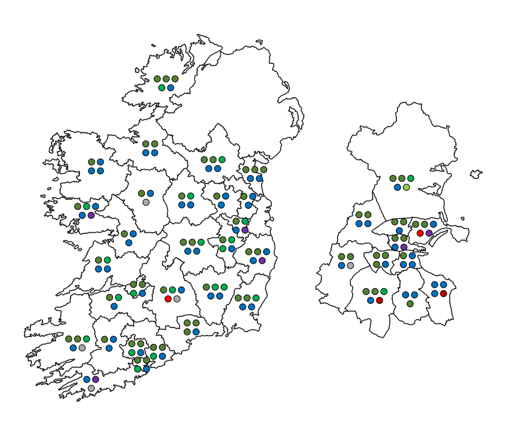 Despite recent polling not looking good for the government, Fine Gael and Fianna Fáil see no overall change this month. Nor do the Green Party, but they don’t have much further they can fall, seat-wise at least. A lot of constituencies are moving closer, as I’ll discuss below, but the only net change from February is a Sinn Féin loss. Granted, that’s in an extremely competitive constituency that I have flagged before as one that will be swinging back-and-forth a lot over the coming months. The overall map is below: