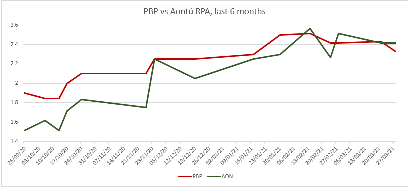 I’m going to digress here to talk a bit about RPA. This is primarily for the benefit of the gigantic doofuses at Aontú, who not only lifted my work without credit or attribution (always a sign of a highly professional political outfit) but also have clearly demonstrated to everyone that they either don’t understand what the word “consistently” means, or how RPAs work (or both). To demonstrate the falsehood of their claim, here’s the RPA for Aontú measured against PBP:
