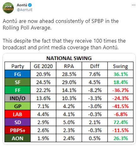 Firstly, we’re talking fractions of a percentage in polls that have an MoE of usually ~3%; taking that as concrete is seriously not knowing how to read polling. All the RPA says is that on a weighted average of the last 10 polls, Aontú are ahead by a number (0.085%) that is so far within the margin of error that it may as well not exist. Secondly, neither are “consistently” ahead in the RPA – Aontú and PBP have been swapping places from miniscule swings over the last five polls. Finally, if your polling average is less than 2.5%, you probably have slightly bigger things to focus on than the performance of other parties. Anyway. Back to the main stuff.