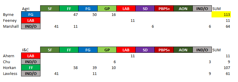 Byrne ends up with a slim majority, and Horkan just below; it would only take a couple of Independents or transfers breaking his way to put him over the top. This remains realistic – I’d expect some of the rebel Green votes to find their way to Horkan before Lawless, and it’s possible that one or two independents will too. On the other panel, if Byrne ends up narrowly short, Labour have an absolutely wretched recent history of sending transfers to Fine Gael, and I’d expect a couple to break her way there as well. The margins under the current expectations are incredibly slim, so it really will only take one or two votes to tip the scales.
