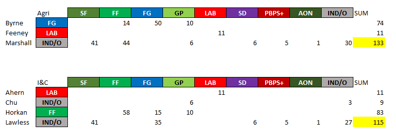 A rebellion of the same size to the LCC vote would cost the government around 15 votes, and that would put us in the same ballpark as the last chart – which has a rebellion of 11 on Agri, and 17 on I&C. To make a difference, despite all the rumour and drama, the government voting pact needs to collapse on a much bigger scale than what has been reported in the papers so far. The best comparison for this is the 2018 by-election for the Agricultural Panel, where at least 40 members of the Confidence & Supply arrangement (FG & FF) didn’t vote for their own candidates, resulting in the election of Ian Marshall. We’ll find out soon if history will repeat for him.