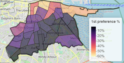 Dublin Bay South is itself one of the most affluent constituencies in Ireland, but is sharply divided between high- and low- deprivation areas; something that maps very closely with certain parties’ votes, which we will explore more. It’s also worth noting that its overall an extremely low turnout location, with turnout generally better south of the canal, but still way below national averages.