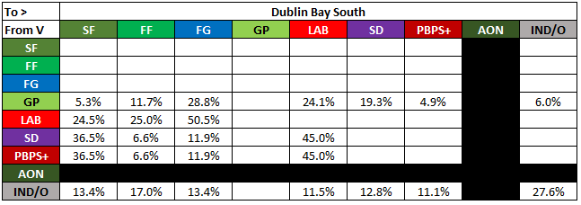 Fine Gael’s advantage is slowly dropping (they were in the mid-30s late last year) but their closest rival, Sinn Féin, have barely budged in the same timeframe. Bearing in mind that in the 2020 GE, despite FG’s relatively weak performance overall, and SF’s advantage nationally, they beat SF in DBS by a comfortable margin – 27.7% FPV to 16.1%. DBS is a very, very friendly constituency for FG. If we apply the above swing figures to the 2020 results, this is what we get: