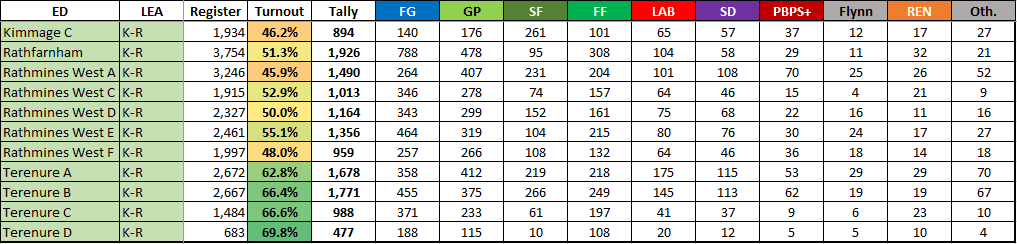 Similarly, they also need Fine Gael’s voters to not turn out – with such an uninspiring candidate, its very possible – across the entire constituency. They also need those FG voters to not switch to FF/LAB/GP and continue their preference, but stay home entirely. It’s unlikely, but to put some numbers on that: Turnout in the southern two LEAs will need to drop at roughly twice the rate it does in SEIC, Boylan will need to overperform 2020 by the equivalent of a 25% swing, and Geoghegan will need to underperform by about 25% as well. This would put Boylan in a position where she can win. The first is tough, the second very plausible, the third would be absolutely remarkable.