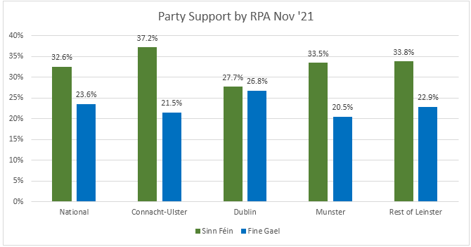 However, relative numbers matter as much as absolute ones do, and dropping behind SF in Dublin on the RPA is bad news for FG. Firstly, as you can see below, it means that they are now behind SF in every single polling province: