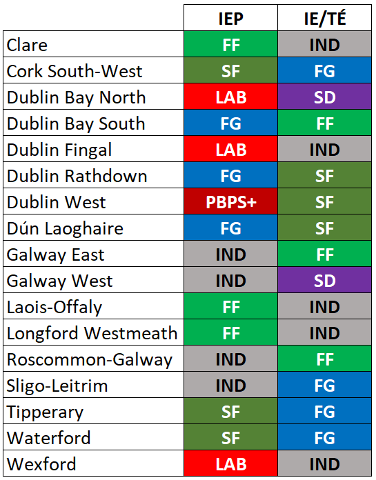 A final, also minor point: I’m not sure if IE/TÉ factor in transfer projections. I don’t see this as being key in any of the areas where we have different results, but it may be a contributory factor in combination with the above. Either way, again, this is fine – if you don’t include transfers you are missing a big chunk of data, but if you do include them you are dealing with extremely volatile data than doesn’t necessarily align with broader voting trends. There is no perfect solution here – either including or excluding them is inevitably problematic.