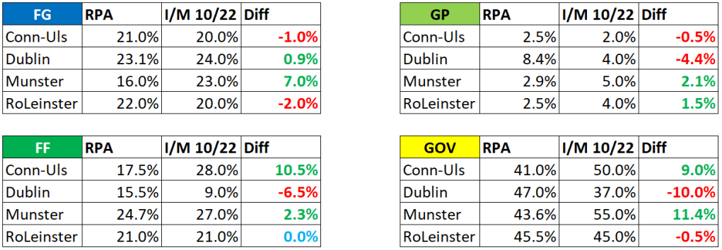 What we see here is where the poll detected changes in support from the RPA taken immediately prior to this poll. Any poll in isolation will usually show some degree of variance from averages, so that’s not particularly interesting. But you can do a lot with this – for example, I could create a narrative here that the Green Party is going to be wiped out for sure because their support is down 66% in Dublin since the GE – whereas in reality an average of polls show us that they are only down by about half this much, and have a shot at keeping a number of seats.