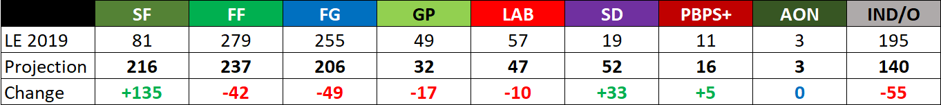 Fianna Fáil and Fine Gael are in a broadly similar position. In 2019, they won 534 of 949 seats between them. This was nothing new in the sense that FF and FG have, in some combination, never failed to majority of seats on local authorities (since both parties were established, or at least as far as I can find). The projection indicates them going below that majority threshold for the first time. This is fairly meaningless from a pure electoral politics point of view, but if it happens, will be another milestone continuing decline of the two major parties.