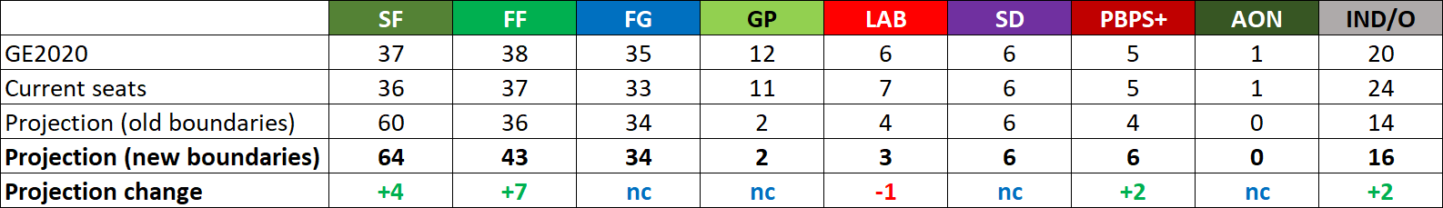 Anyway, a summary of the new projections here. The Fianna Fáil figure includes the Ceann Comhairle: