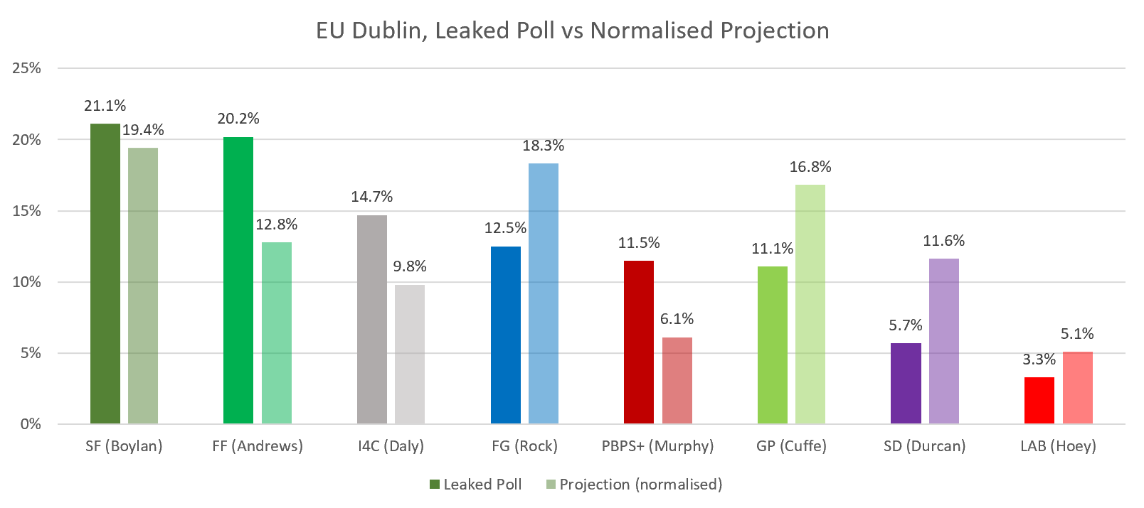 Not too long ago, we had an EU Election poll taken by Ireland Thinks leaked (allegedly by Fine Gael, which as we’ll see below is odd) for the Dublin constituency. This is handy for me because of the way Dublin is drawn – it’s significantly more simple to put together a projection for than South or Midlands-North-West. I should point out, similar to my local elections post, using national polls to project European elections is not wise, but I’m going to do a comparative here to illustrate a few points that I think are interesting. Firstly, the results off the poll versus what the projections would show if applied to the European elections (and again I should note that the projections are not designed to apply to European elections):