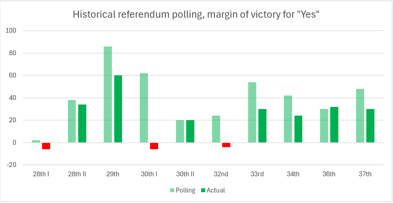 First, a note on methodology – this used the three most recent polls preceding a referendum vote (unless less polls were available, or unless >3 polls were doing simultaneous fieldwork). The figures were then normalised to exclude don’t knows/abstains/other, and rounded to the nearest figure. This isn’t a perfect measure but it gives a reasonable idea of where the polls were preceding the vote. Note that for some referenda (e.g. 31st amendment) I could not find polling data and thus they are not included in this.