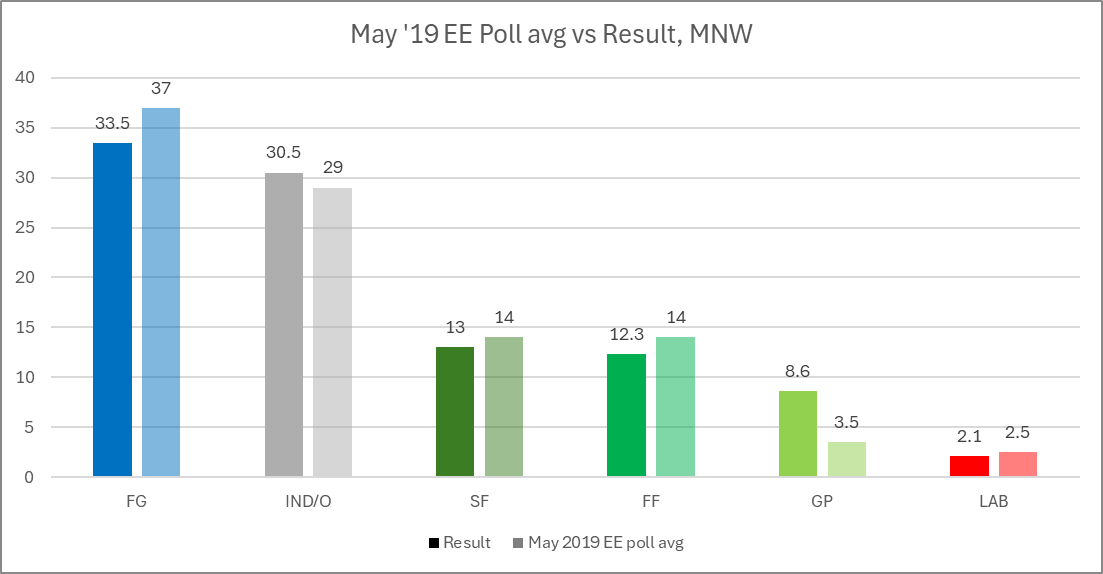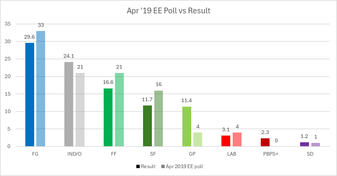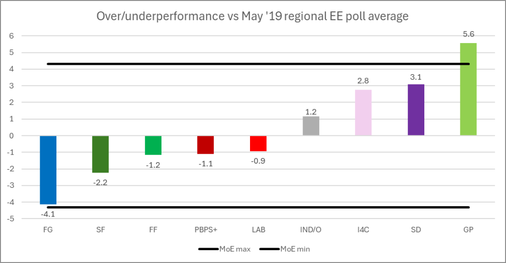 This again could be taken as a sign of changing preferences late in the process, or of a systemic polling error; it’s very difficult to say from a small sample. But this does provide some insight into the greater level of error in European polling versus General Election polling. It also should be noted that these errors do not necessarily replicate over time – one should not assume, for example, that because FG were overpolled in 2019, they definitely will be again in 2024.