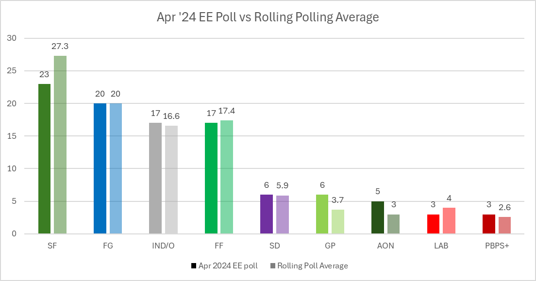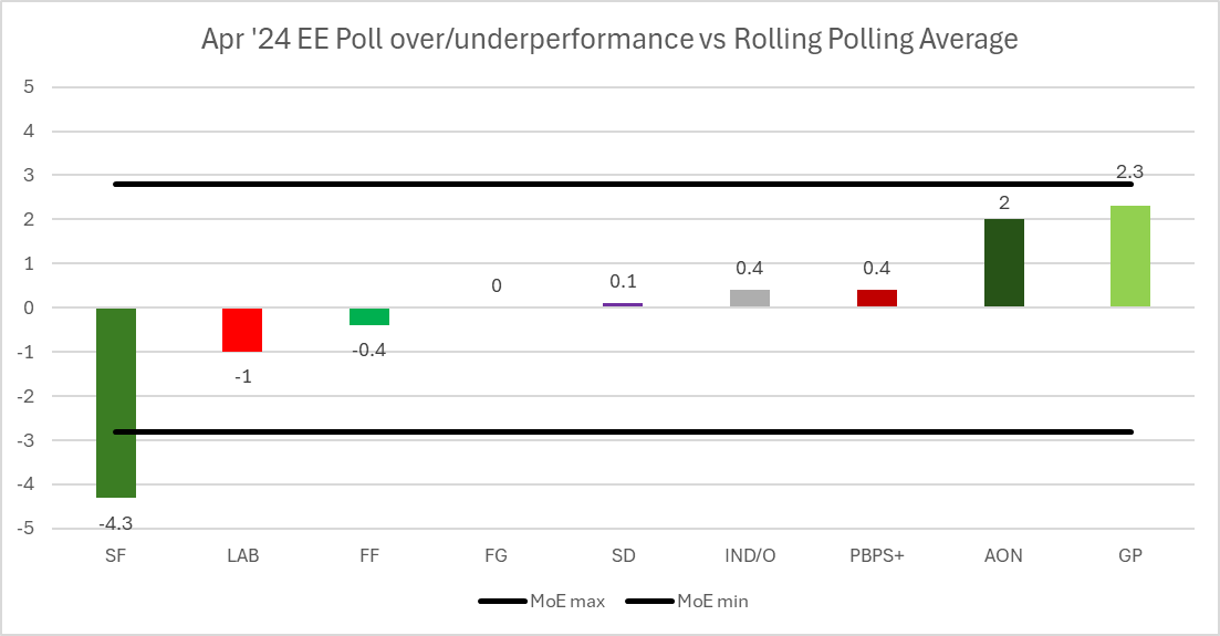 For SF, there could be a number of factors – polling declining faster than the polling average, an outlier poll, or simply that people are less inclined to vote for SF in European elections than in a general. The last one is the most interesting prospect – but we can’t verify that this is the case. For example, in 2019 and 2014, SF did better in the EE than the LE. But this is the lowest they have been in any poll for a long time; it won’t of course be until polling day that we know for sure what the cause is.