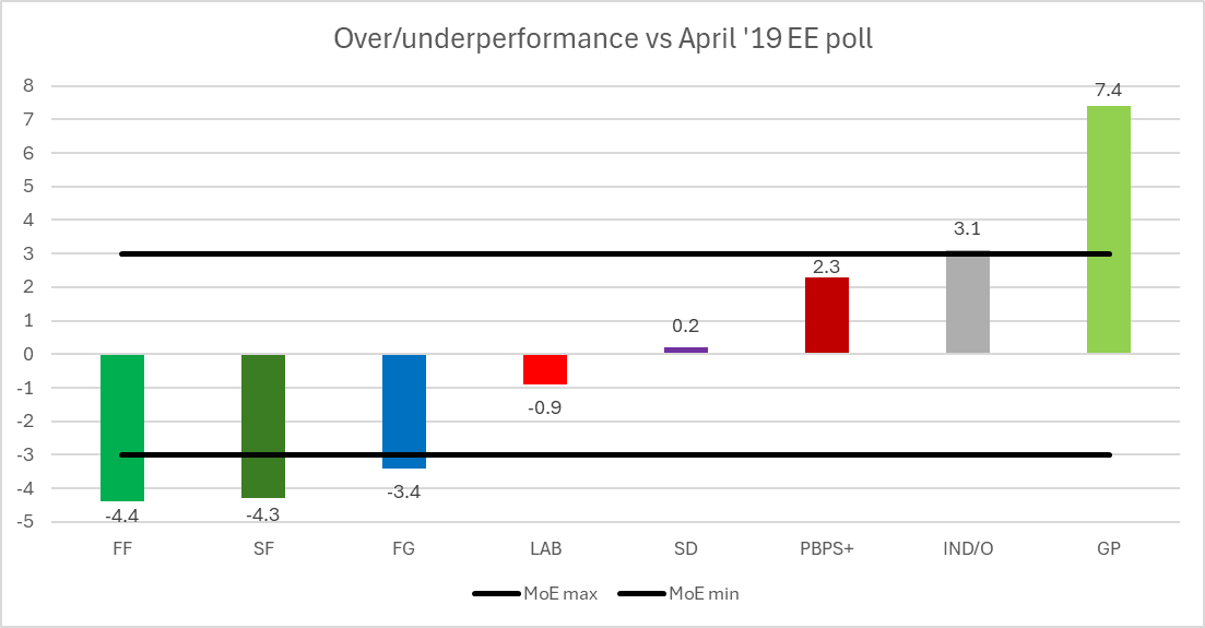 First though, some context. When we look at the last election in 2019, the best comparison point on national figures is the Red C poll published April 17th, for the vote on May 24th. On a raw vote level it wasn’t great – with Sinn Féin, Fianna Fáil, Fine Gael, Independents and the Green Party all being missed by more than the margin of error. While part of this can be attributed to movements during the last month of the campaign, as we’ll see below, closer polling also had substantial errors. The Greens, it is worth noting, were particularly underestimated here, far beyond a normal polling error.