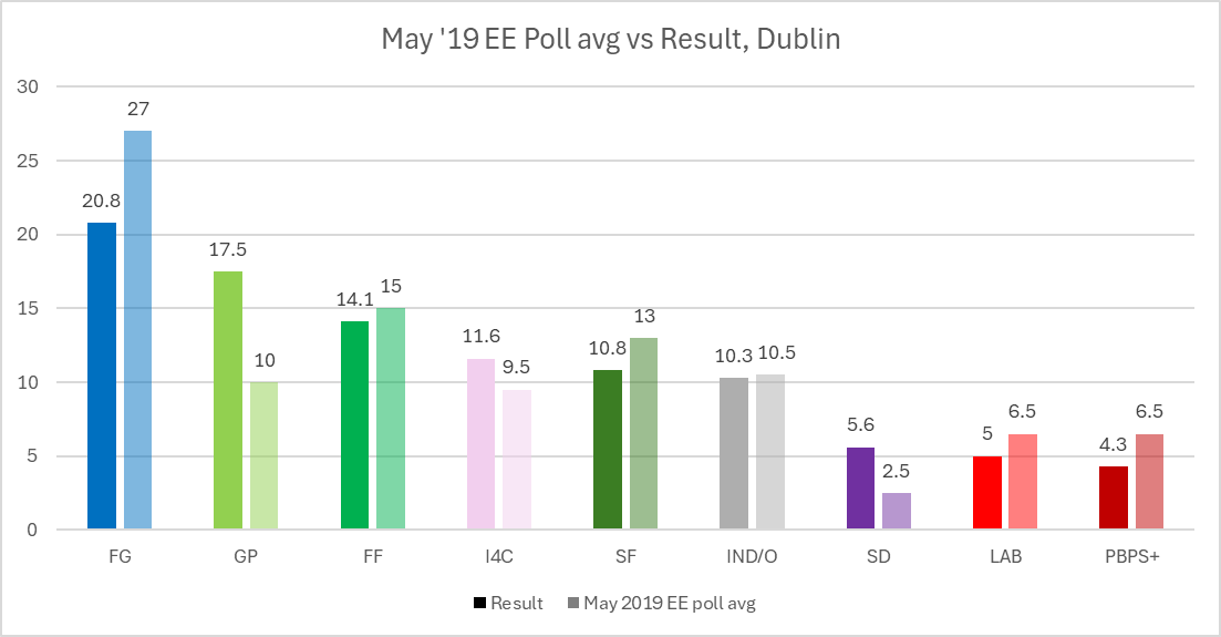 - In Dublin, the polls missed Ciarán Cuffe topping the poll for the Greens, although still likely giving a good enough performance for a seat, and would have had Lynn Boylan (SF) narrowly defeating Clare Daly (I4C), even with Daly’s better performance on transfers.