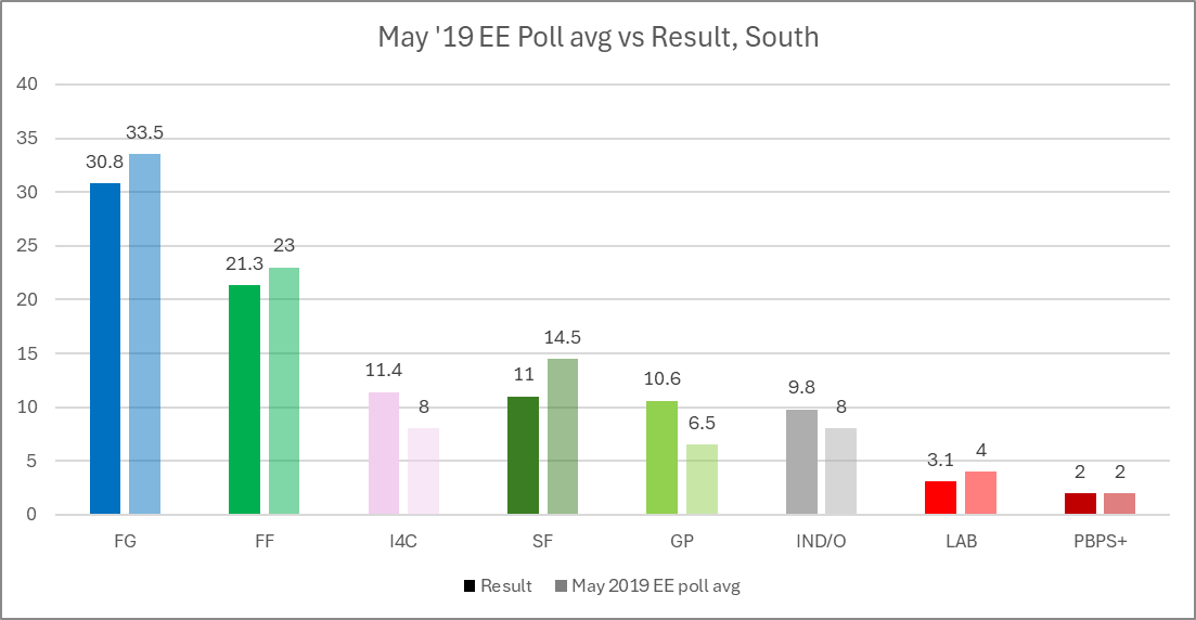 It is of course worth noting that national level polling will always have limitations – even with the very large European Parliament constituencies. So let’s look at the regional polling from 2019 – we have regional polls published by both Red C and IPSOS, on the 16th and 10th of May respectively. These came much closer to the day of the vote, but the output was a mixed bag; perhaps in part due to the smaller sample sizes used (500-825).