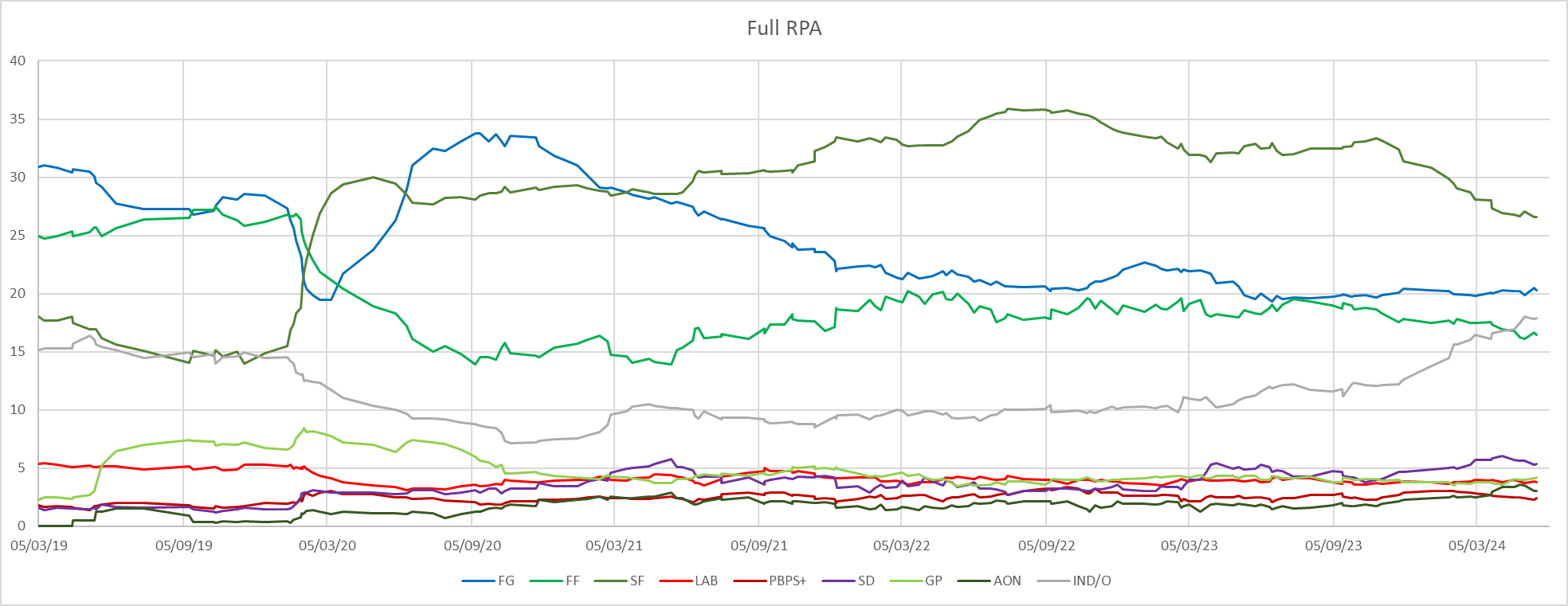 This is a surprise. The Fine Gael figure is less so; they were averaging around 20% so while certainly a positive sign for them, this is a movement within the MoE range and is normal. Whether this is the start of a meaningful upward trend or not will become apparent with more data, but they will certainly be encouraged by these figures, particularly with them coming so close together. But it’s certainly less significant than what we are seeing with SF.